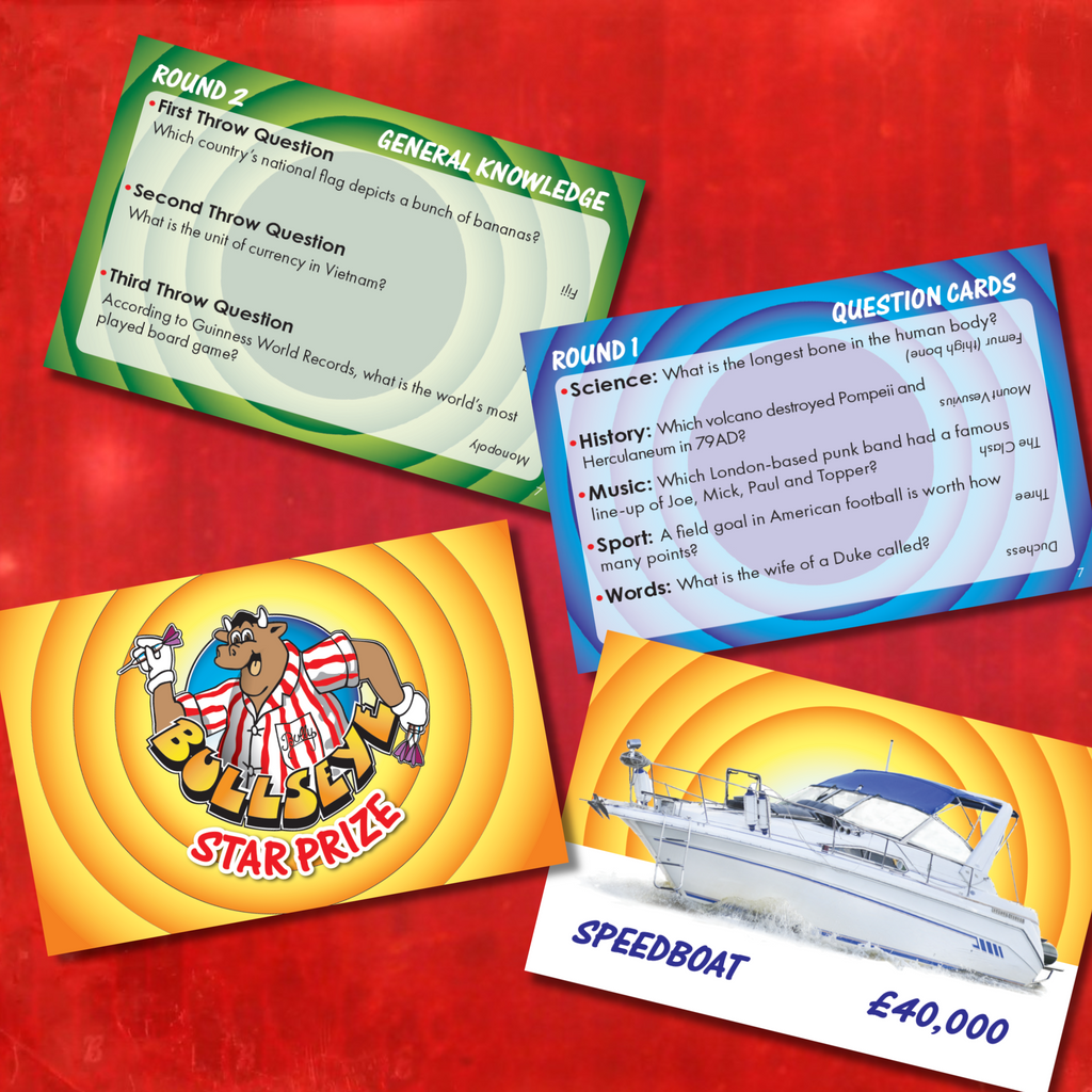 With a dartboard, darts and hundreds of questions so that you can have a super, smashing, great time!