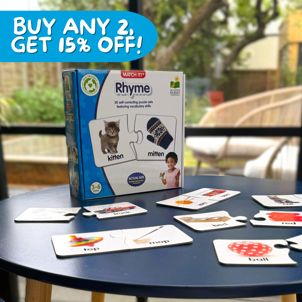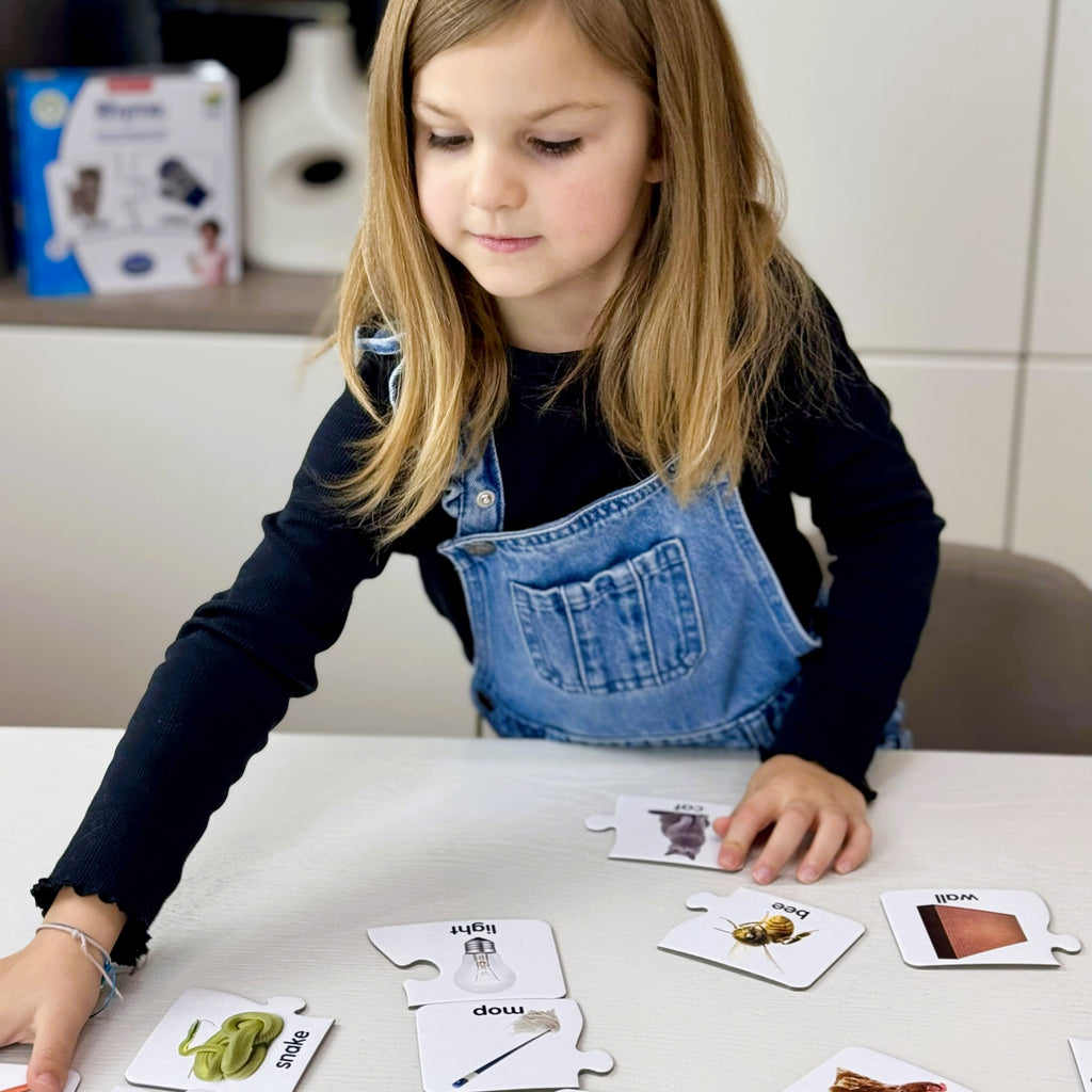 Learning vocabulary through rhymes is great fun with the Match It! Rhyme. The Match It! Rhyme Puzzle Set includes a colourful set of rhyming puzzle cards that provide children with an excellent introduction to rhyming words and basic vocabulary. 30 puzzle pairs give hours of fun and you can choose whether your child works with you to complete each pair or encourage them to develop important independent working skills. This bright collection of two-piece puzzles aimed at children ages 3 and up is a perfect introduction to rhyming words, helping to build a foundation for literacy skills.