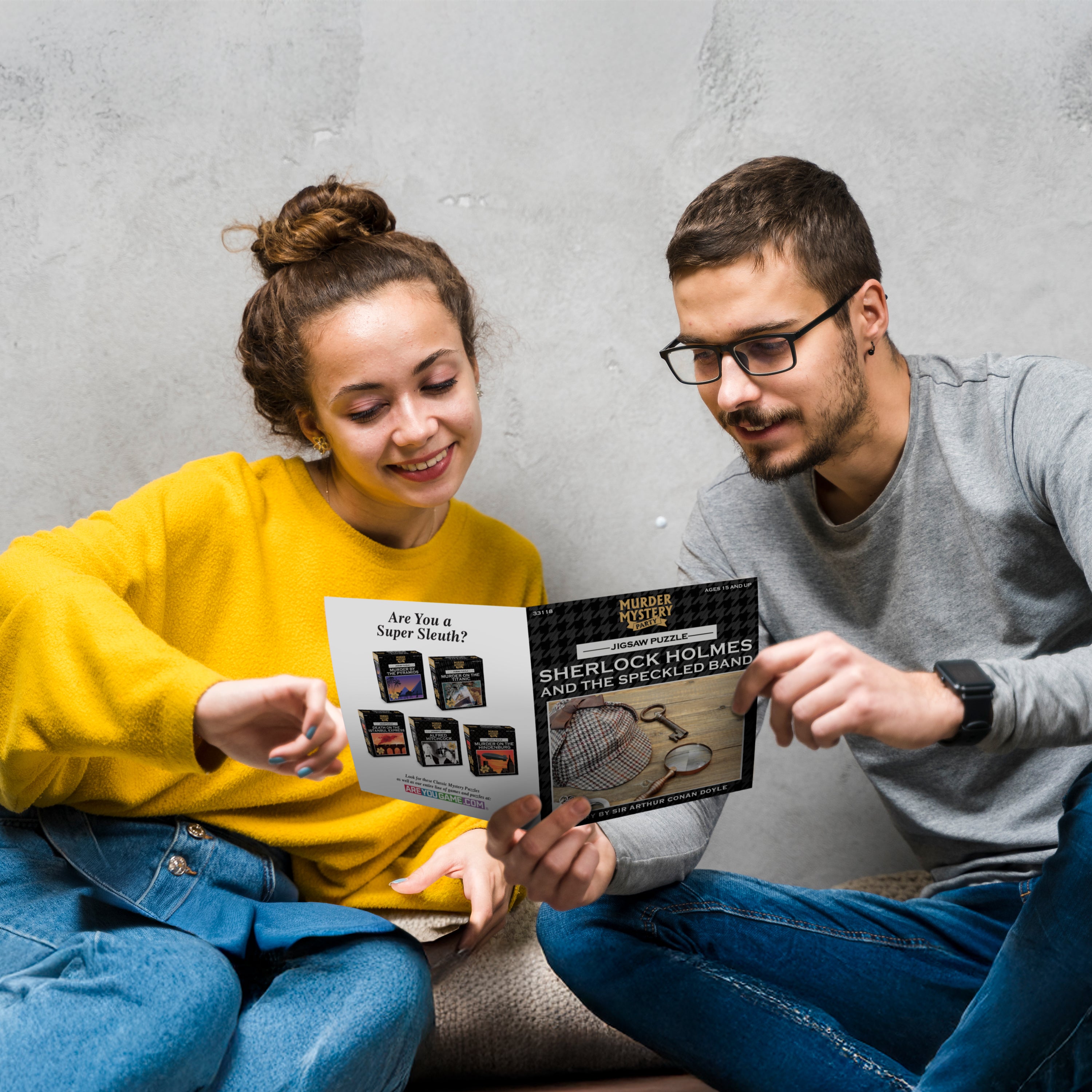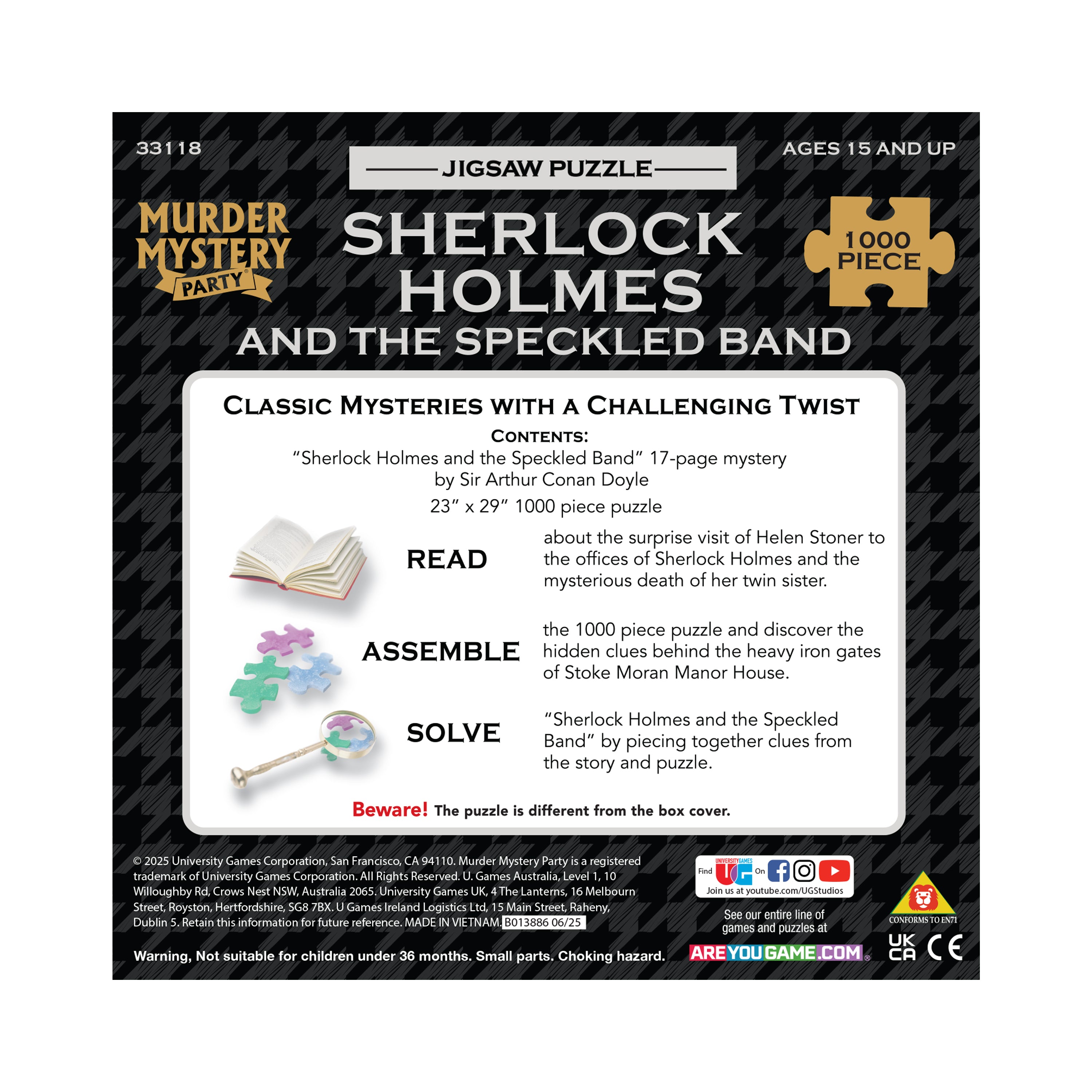 Calling all super sleuths! Sherlock Holmes and the Speckled Band is much more than just a jigsaw puzzle, it is a murder mystery waiting to be solved! First, read the story included about the surprise visit of Helen Stoner to the offices of Sherlock Holmes and the mysterious death of her twin sister behind the heavy iron gates of Stoke Moran Manor House. Next, assemble the 1,000-piece puzzle to uncover hidden clues but don't be fooled by the image on the box front, the picture that the completed puzzle reveals is very different! Unleash the detective within and piece together the evidence to reveal the murderer and solve the crime. Sherlock Holmes and the Speckled Band is a great gift for those who enjoy jigsaw puzzles, mystery buffs and any fan of Sherlock Holmes.