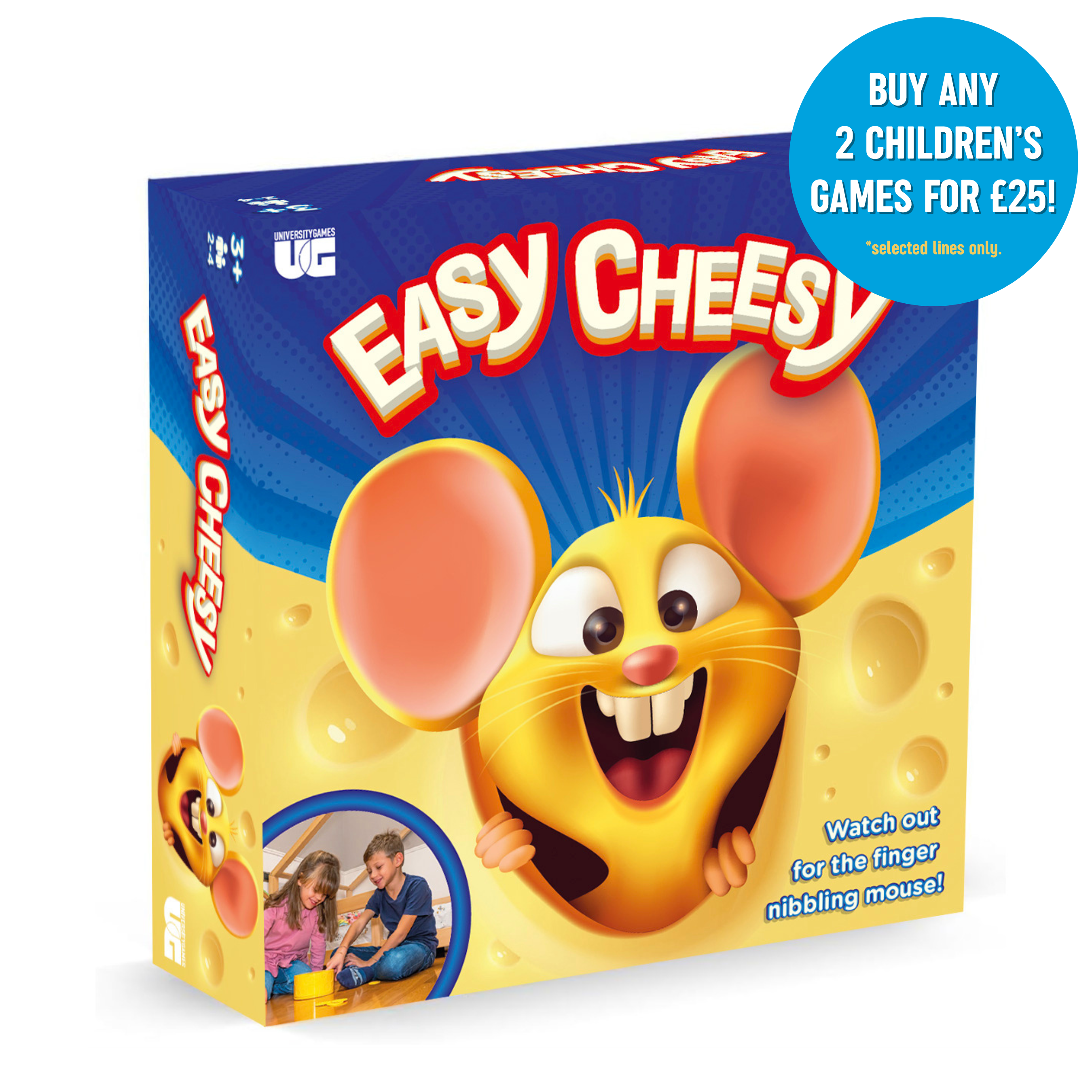 In the amusing and entertaining children's game "Easy Cheesy" everything revolves around cheese and a small, nibbling mouse called Nibbles. Hide the mouse in the cheese, place the flexible cheese pieces over the holes and give the cheese a spin! As she hides, players pick which hole to put their finger in! But watch out, as soon as you disturb Nibbles hiding place she will nip you and you will lose your cheese pieces! Will you avoid the mouse or will you get nibbled? The winner is the first to secure three pieces of cheese before being nibbled!