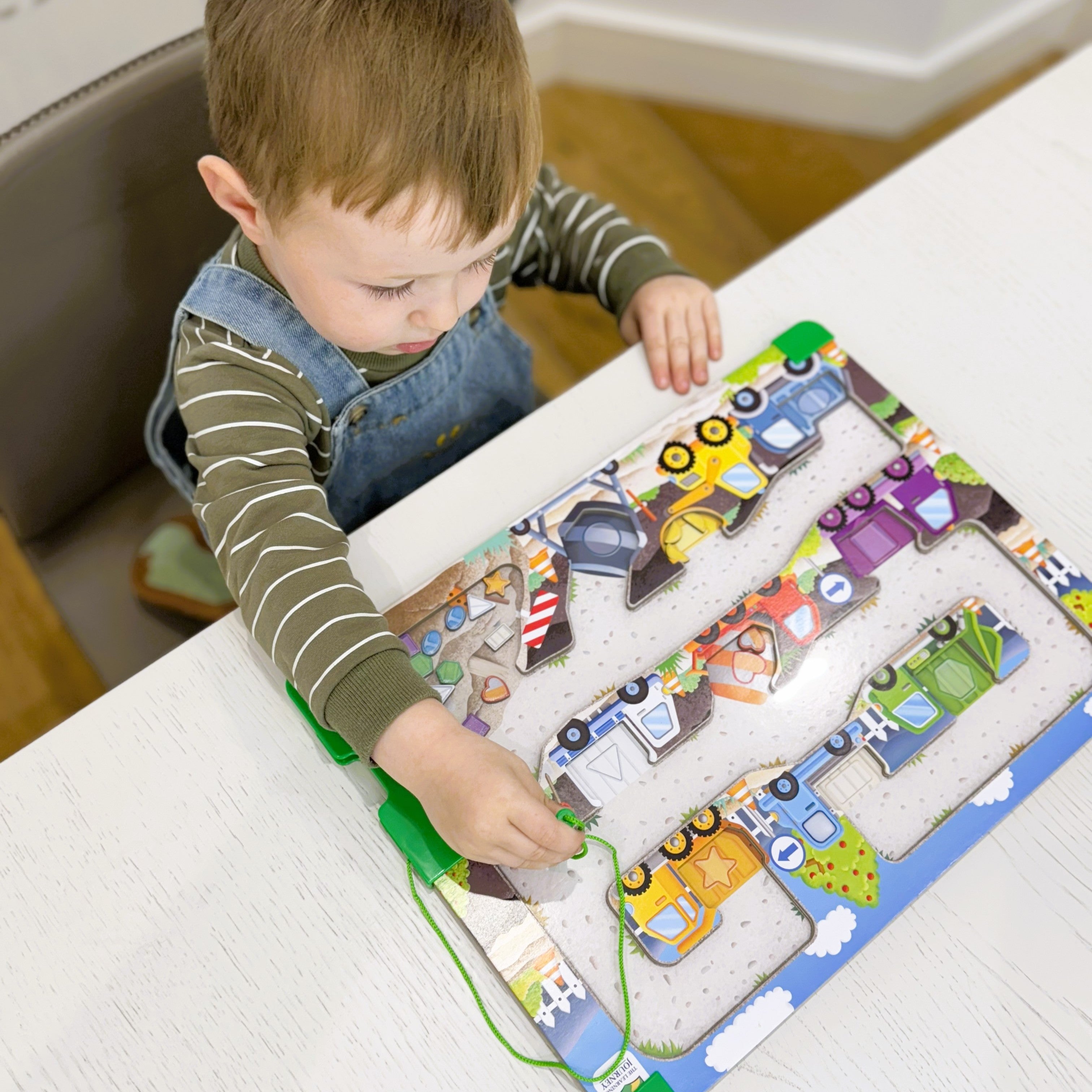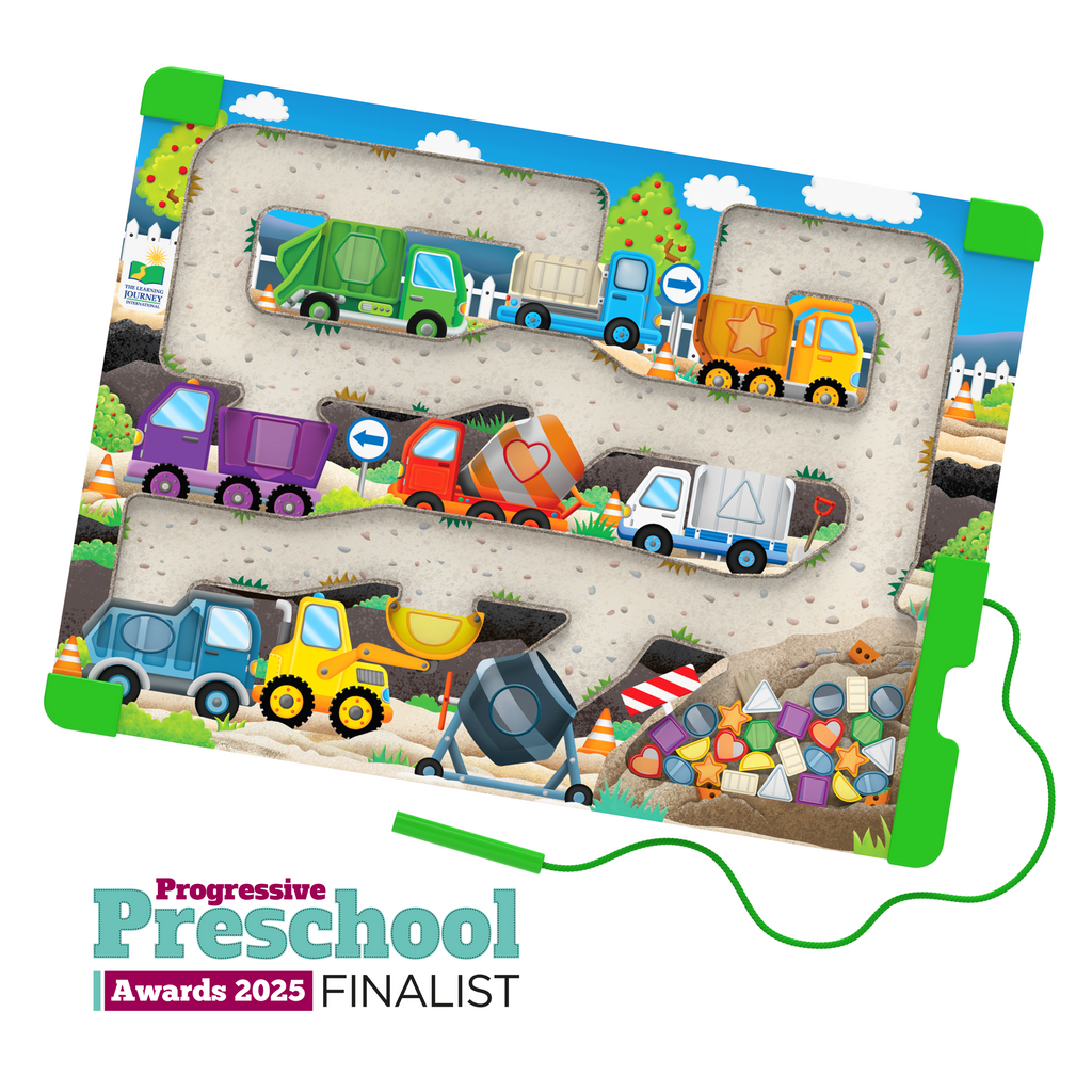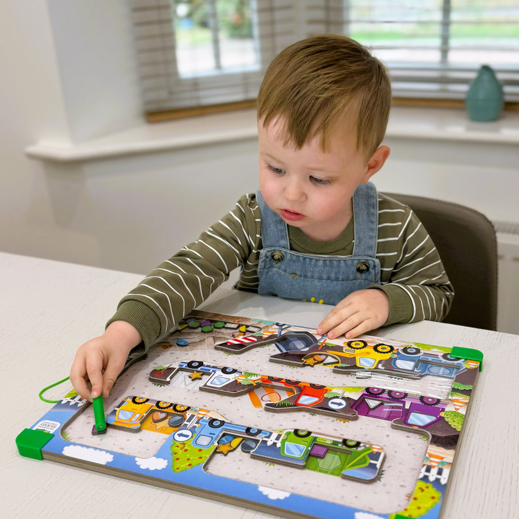 Little ones will love to explore this fun construction maze, as they sort the shaped pieces into the corresponding location. This fun and colourful hands-on diggers and trucks magnetic tray puzzle helps children to learn colours and shapes in a fun and engaging way.