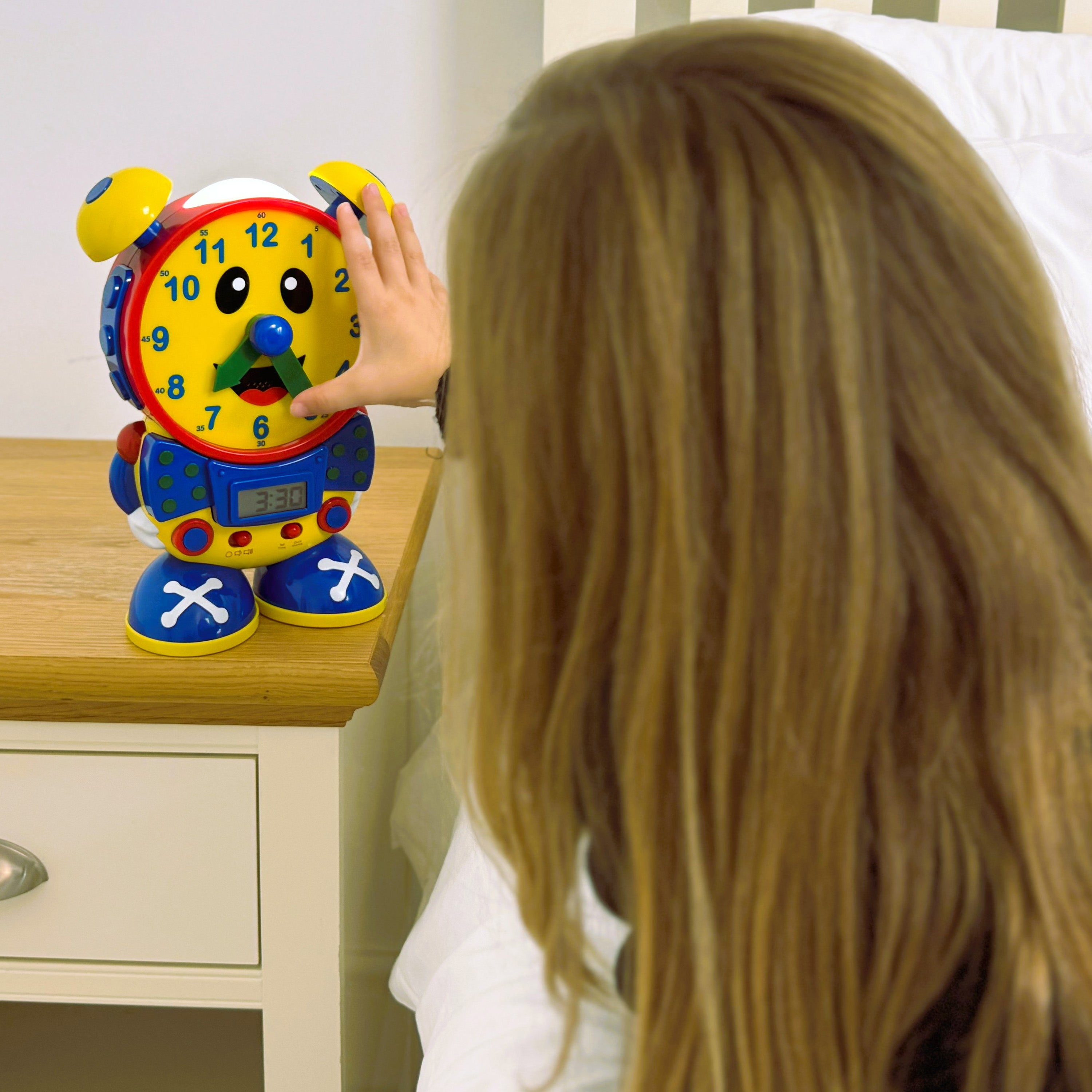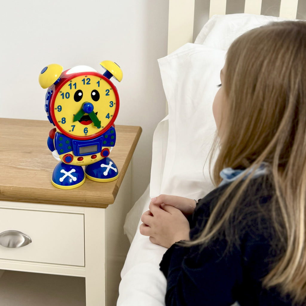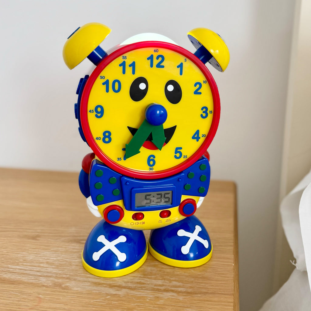 Telly the Teaching Time Clock is the perfect companion to learn the time with! Let Telly the Teaching Time Clock help your child learn to tell both analog and digital time using two quiz modes. In the learning mode, Telly teaches time in five minute increments by moving the hands and updating the LCD screen. In the quiz mode, Telly asks your child to move the hands on its face to match the time displayed on its screen. Telly also features a real working clock and night light. Learning to tell time has never been so much fun! Educational Benefits: Promotes listening, self-confidence, fine motor skills; encourages problem solving and independent play. Assists children with learning to tell the time. Suitable for age 3 years and over and requires 3 x “AA” batteries (included)