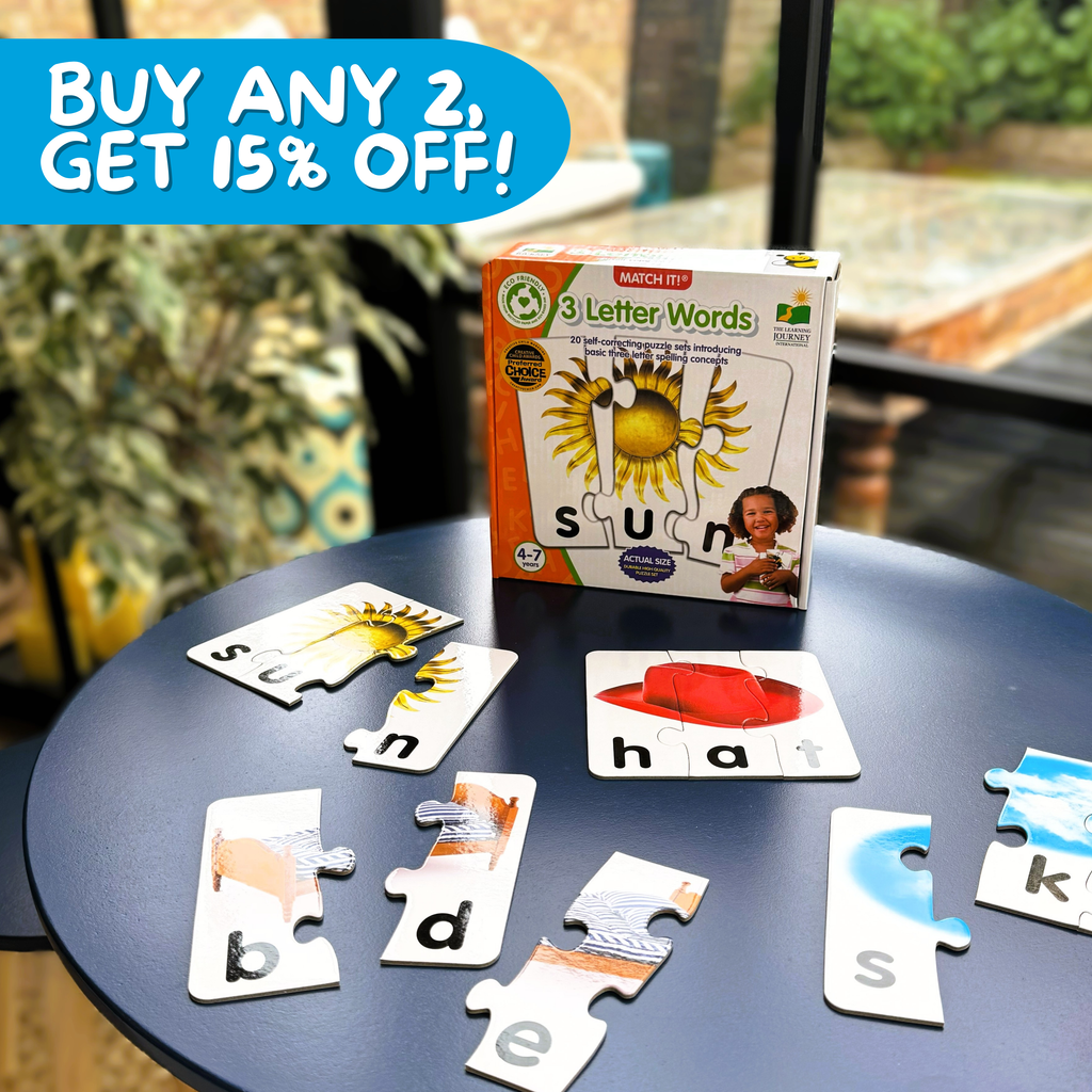 This bright collection of puzzles aimed at children ages 4 and up is a perfect introduction to three letter words. The Match It! 3 letter Words, 21 three-piece puzzles, featuring colourful pictures, help your child associate words with objects and are designed to teach early reading skills. The cards are a mix of sight words and CVC (consonant, vowel, consonant) words. As ideal preparation for school, the puzzles make it easy and fun to become familiar with letter, shapes and sounds; a perfect introduction to the early reading skills that they will encounter at school. They also strengthen the child’s developing concentration skills and build focus.