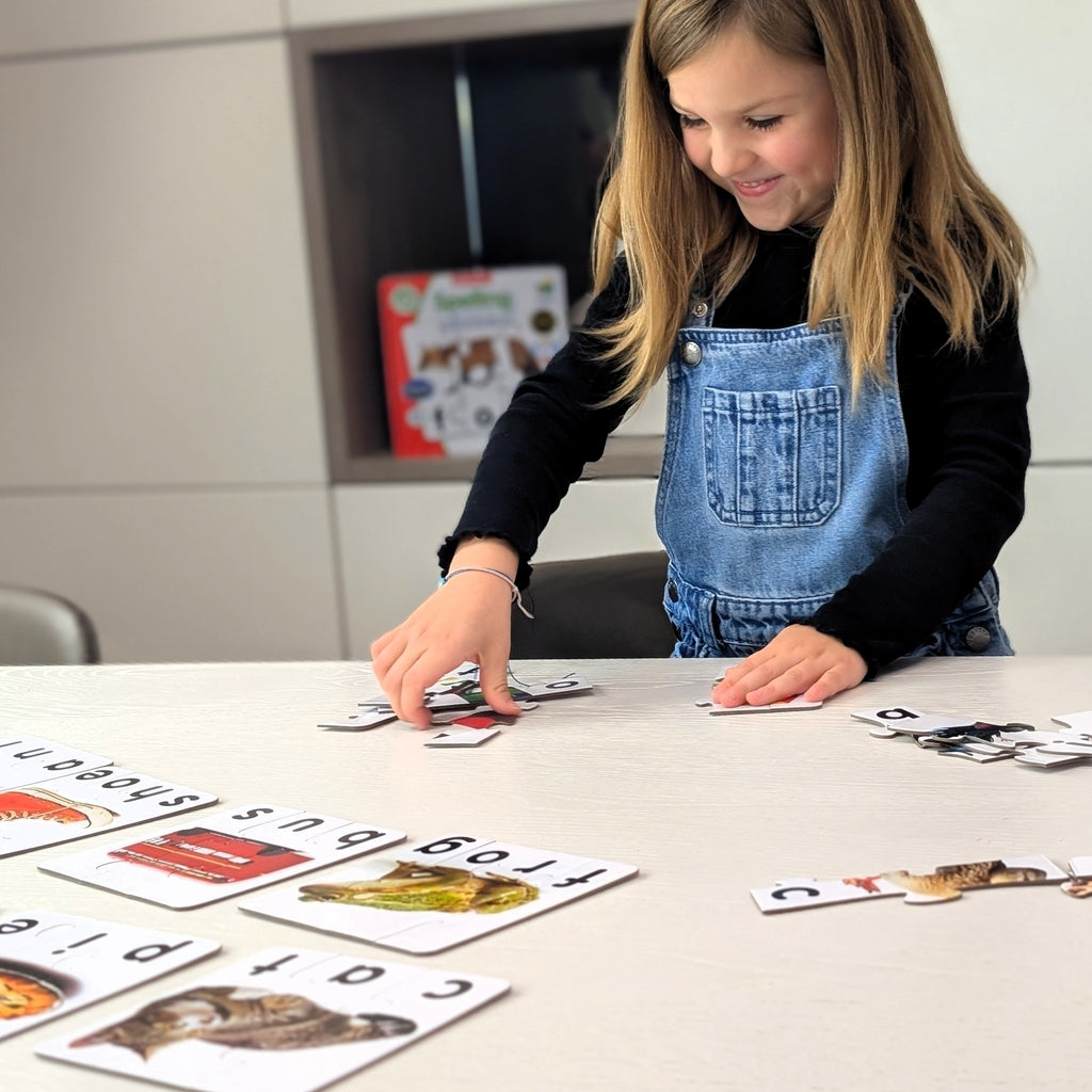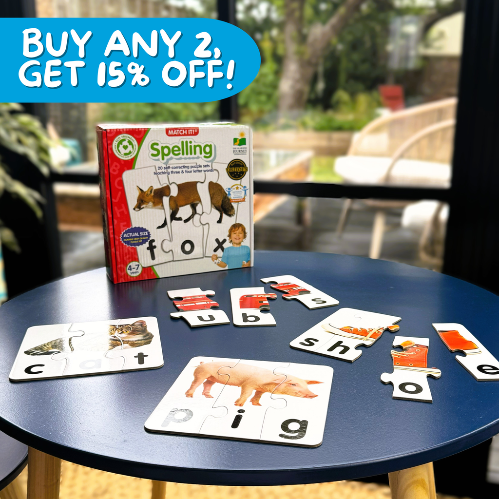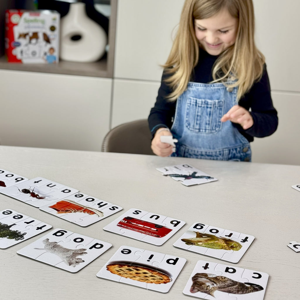 Build on early reading skills with the Match It! Spelling educational game. The Match It! Spelling collection of puzzles, contain both three- and four-letter words, teach a range of early reading skills including letter recognition, word formation and spelling. By putting the cards together to form a word, the child gains important understanding of the mechanics of reading, all aided by the pictures which provide a clue to the word being formed. Learning to read can be a daunting process, but self-correcting puzzles, where the pieces will only fit if they are correct, can provide a boost of confidence. This can help any child to feel more positive and confident when approaching literacy tasks.
