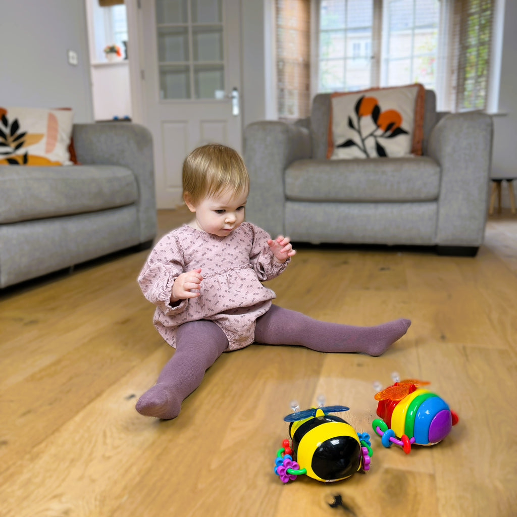 The Crawl About Butterfly encourages little ones to crawl as it moves across the floor and features a bright, baby-friendly design with three fun melodies Tap the cute button nose to wake the bee and then simply press its back to watch it go! The fun, interactive bee includes classic nursery rhymes such as Twinkle, Twinkle, Little Star, Row, Row, Row Your Boat, and Itsy-Bitsy Spider. This award-winning little bumblebee is brilliant for developing gross motor skills for little ones as they first start to explore and crawl! The colourful Crawl About Butterfly toy has many educational benefits that include encouraging independent play and aiding visual and listening skills as well as supporting gross motor skills as it encourages movement and crawling. Suitable for age 6 months and over. Requires 2 x "AAA" batteries (included).
