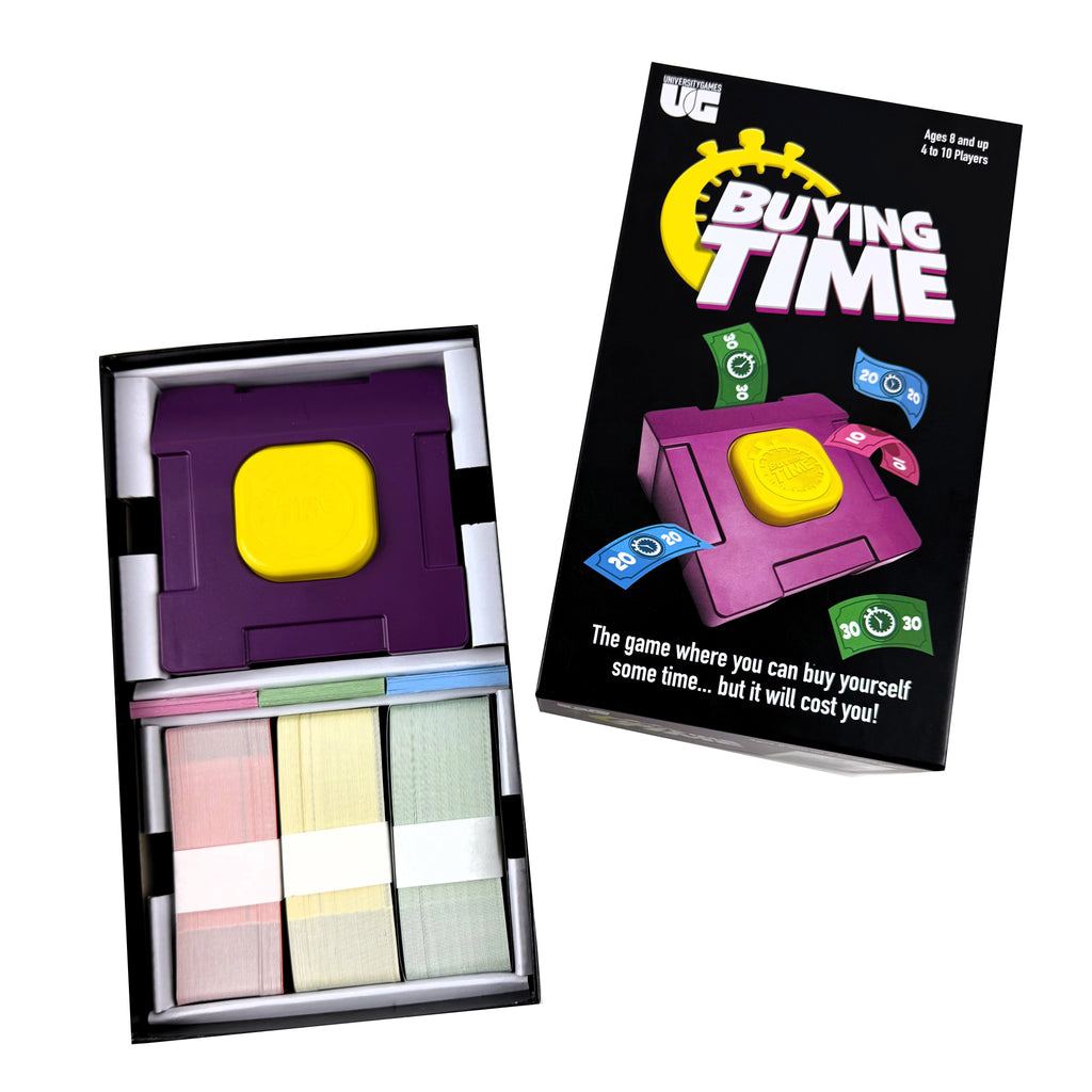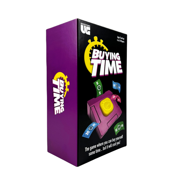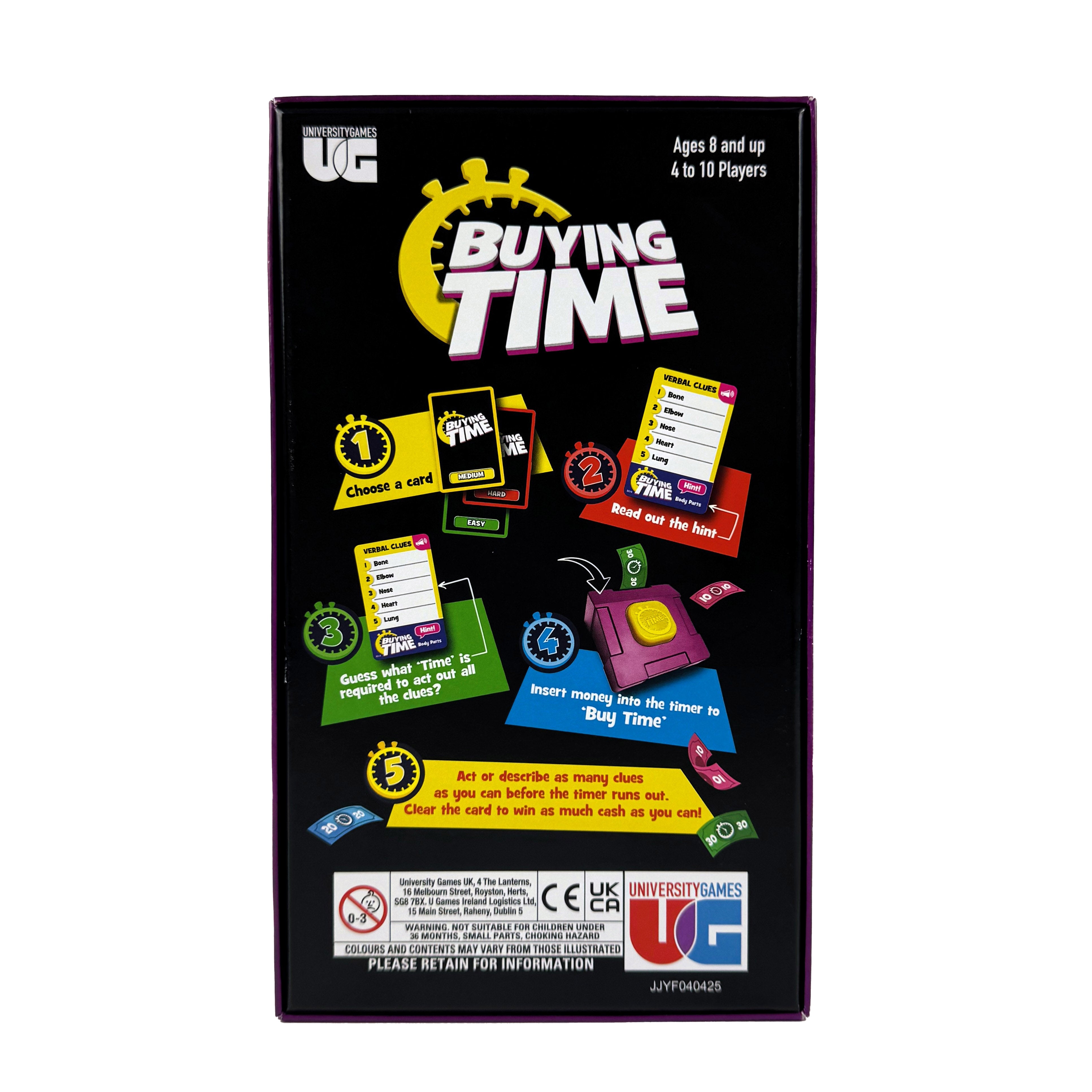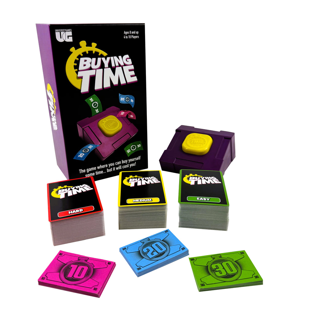 The game where you can buy yourself some time...but it will cost you! Unlike any other board game, Buying Time is the game where you decide how much time you and your team need to answer the questions, but how much are you willing bet to earn more money! Use the clever money counter to insert your money, the money converts to time. But how much time do you really need for your team mates to answer all the questions on the card?