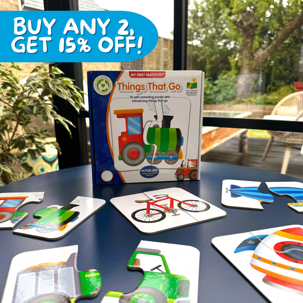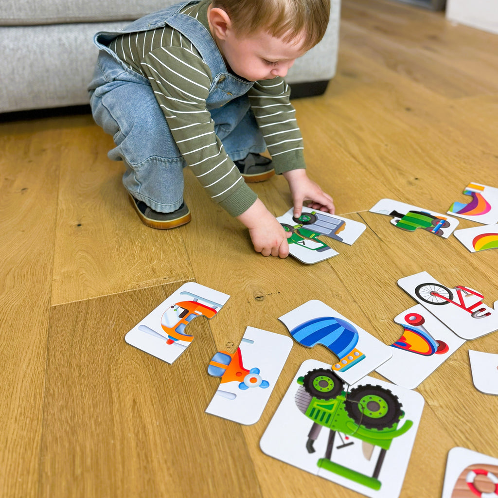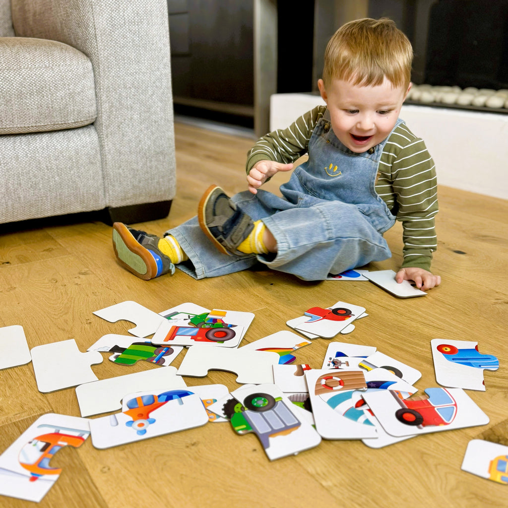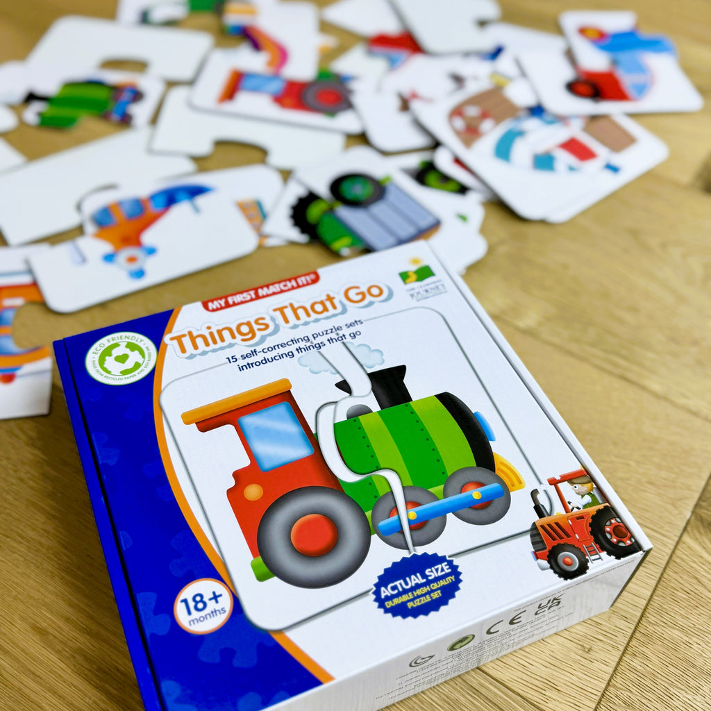 Things that Go puzzles are designed to provide just the right level of challenge for the individual child; begin by offering just two matching pieces; increase the challenge level by simply offering more pieces to choose matches from. The puzzles are self-correcting which means that only one piece will fit with any other, eliminating frustration and making concentration stronger for longer. These puzzles are a great way to help your child develop basic problem-solving skills such as creative thinking and perseverance, as well as improving focus and boosting confidence and self esteem. Suitable for age 2-5 years.