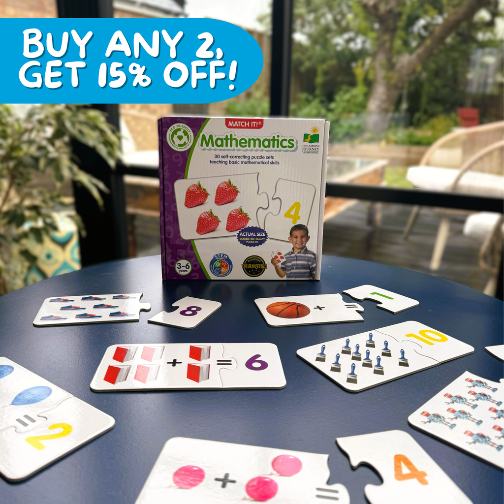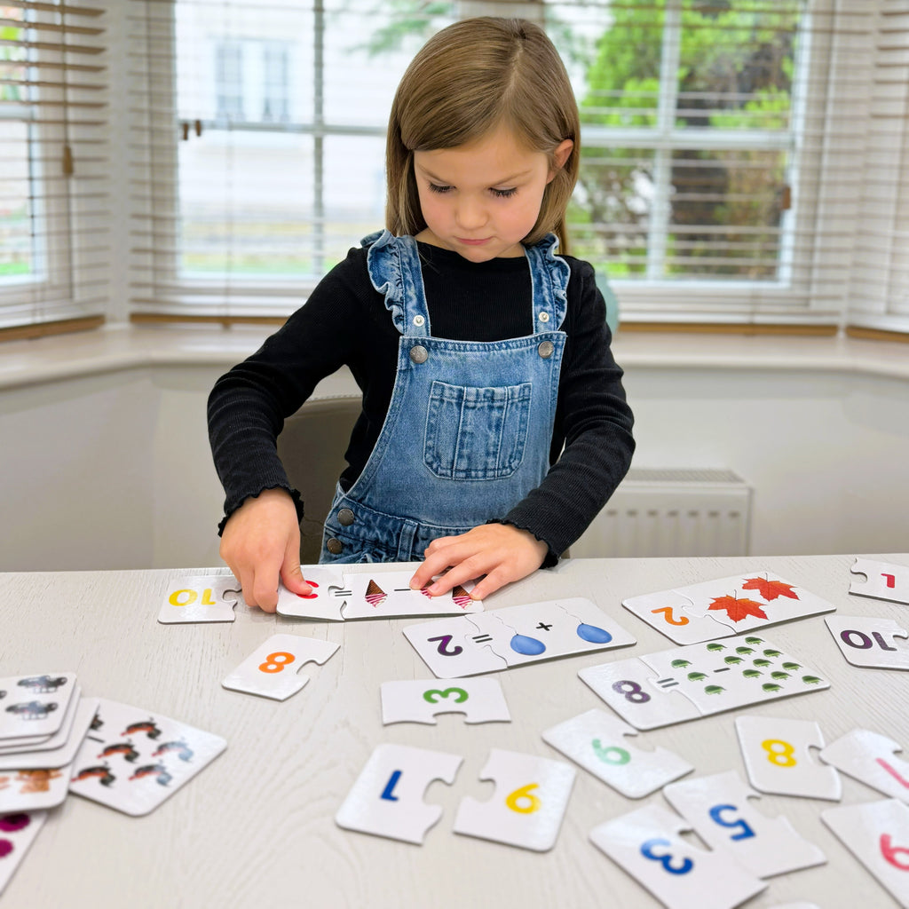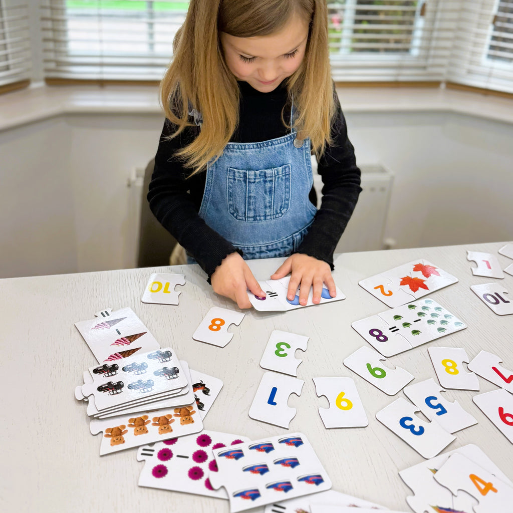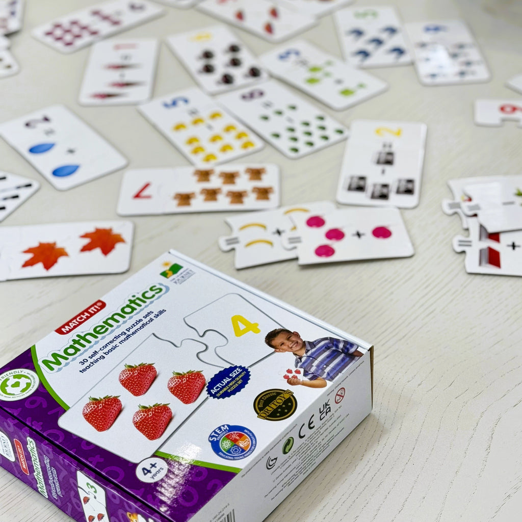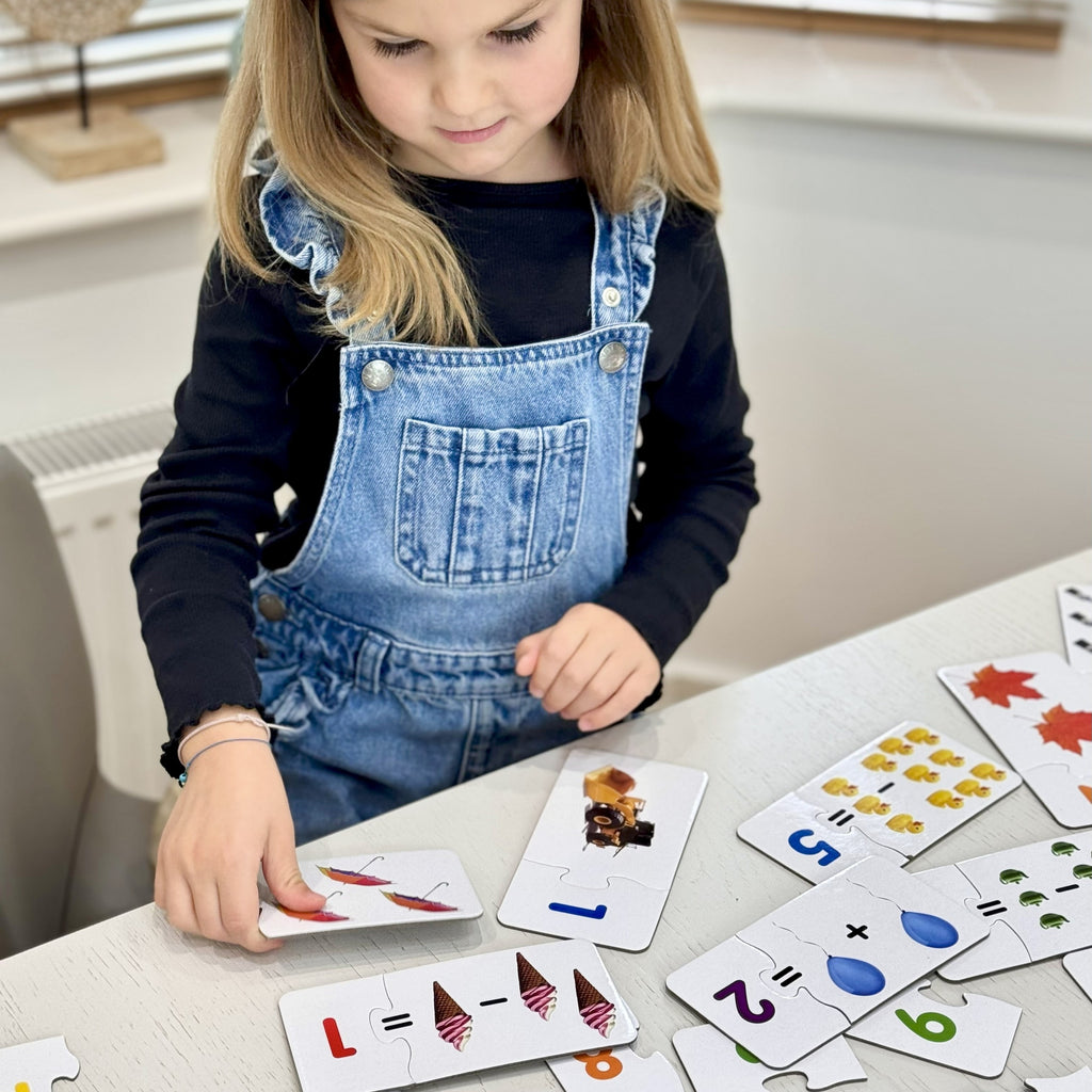 Learning about numbers and basic mathematics with the Match It! Mathematics Puzzle Set and make early education fun! This colourful set of math puzzle cards provides children with an excellent introduction to subitising (number recognition), counting, and basic addition and subtraction. The 30 puzzle cards feature 10 cards of counting, 10 cards of addition and 10 cards of subtraction. The puzzles are self-correcting — only cards with the correct answer will fit together, a fun way to learn basic mathematics. Subsisting (number recognition) and the connection between the written number, is a key foundation for maths and encouraged to be taught at an early age.